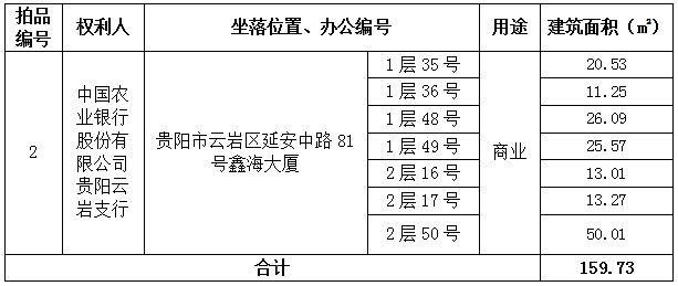 2、貴陽市云巖區延安中路81號鑫海大廈1層35、36、48、49號及2層16、17、50號商業房地產(總建筑面積:159.73㎡);