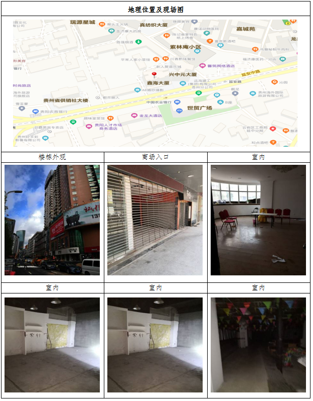 標的位于貴陽市云巖區香獅路198、196號新里程商城1號樓F1層203號;該標的分攤土地使用權面積:98.51㎡ ,總建筑面積:285.72㎡,樓宇總層數:9層,所在樓層:1層,地類用途:商業用地;土地使用權類型為出讓,土地使用權終止日期為:2053年10月23日,土地所有權為國家所有;建筑結構:混合結構;層高:3.3米,建筑用途為商住。