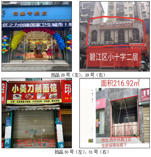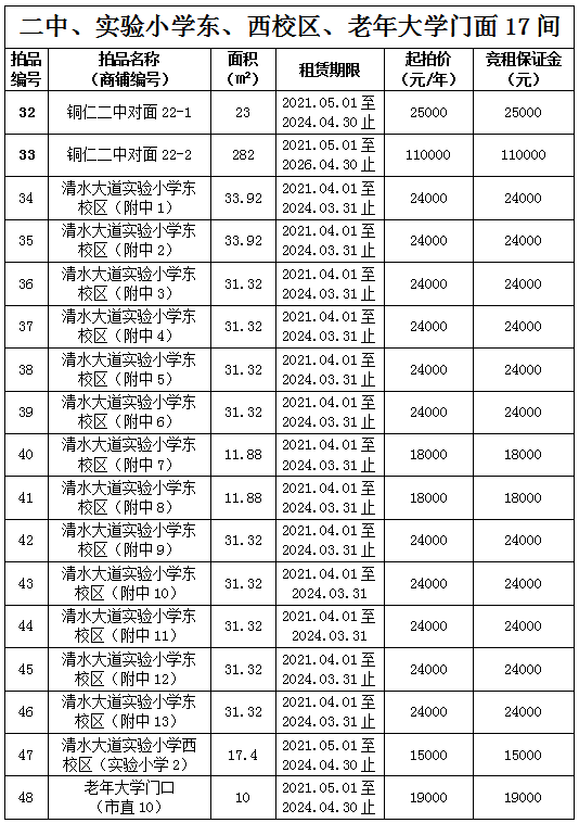 拍品34至46號標的位于銅仁市清水大道實驗小學東校區,面積11.88——33.92㎡,租賃期3年(2021.04.01至2024.03.31止);