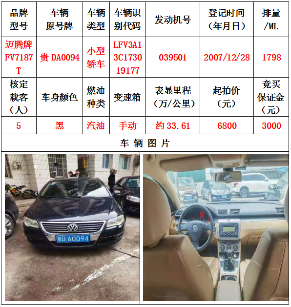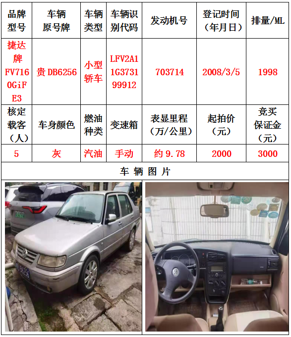 本次拍賣會的拍賣標的其中5輛車,分別為邁騰牌FV7187T小型轎車一輛、豐田牌GTM7200GB-NAV1小型轎車一輛、捷達牌FV7160GiF E3小型轎車一輛、帕薩特牌SVW7203FPi小型轎車一輛、帕薩特牌SVW7203FPi小型轎車一輛,為打包整體拍賣,不作拆分,整體起拍價:42400元,且只對標的現狀進行拍賣,不作任何質量擔保。