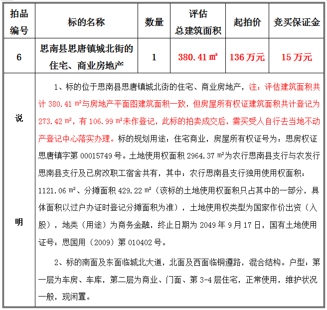 2、思南縣思唐鎮城北街的住宅、商業房地產,建筑面積共:380.41㎡;起拍價:136萬元;競買保證金15萬元。