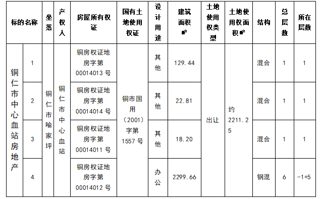 銅仁市中心血站房地產,建筑面積:2470.11㎡,土地使用權面積:約2211.25㎡