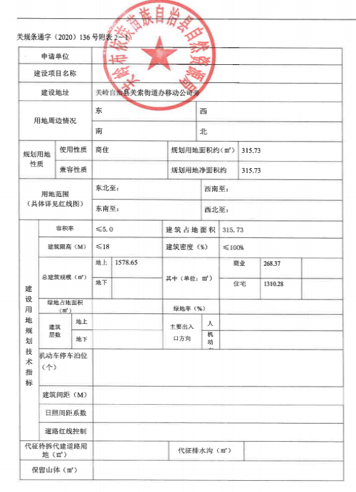 3、買受人須在簽訂出讓合同后,承諾一年內開工建設,三年內必須竣工驗收。如不能按期開工、竣工,自違約之日起,每日須支付土地出讓價款的0.55‰的違約金。建設嚴格按照自然資源局出具的關規條通字(2020)136號《規劃設計條件通知書》中的規定和要求進行建設:容積率≤5.0,建筑密度≤100%;地上總建筑面積:1578.65㎡,其中商業建筑面積:268.37㎡,住宅建筑面積:1310.28㎡;建筑限高≤18米。(詳見附件1)