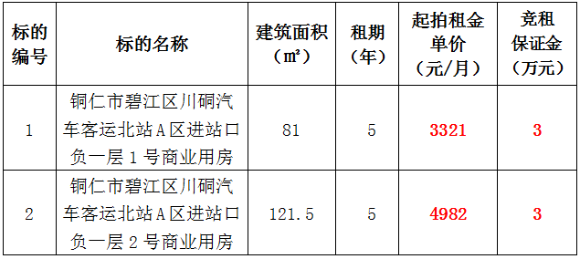 1、銅仁市碧江區川硐汽車客運北站A區進站口負一層1號門面,面積:81㎡,租賃期:5年,起拍租金:3321元/月,競租保證金:3萬元;