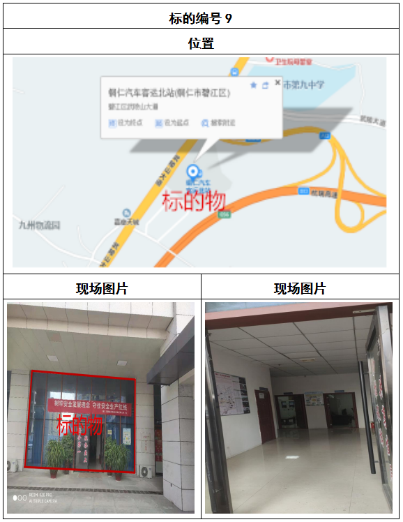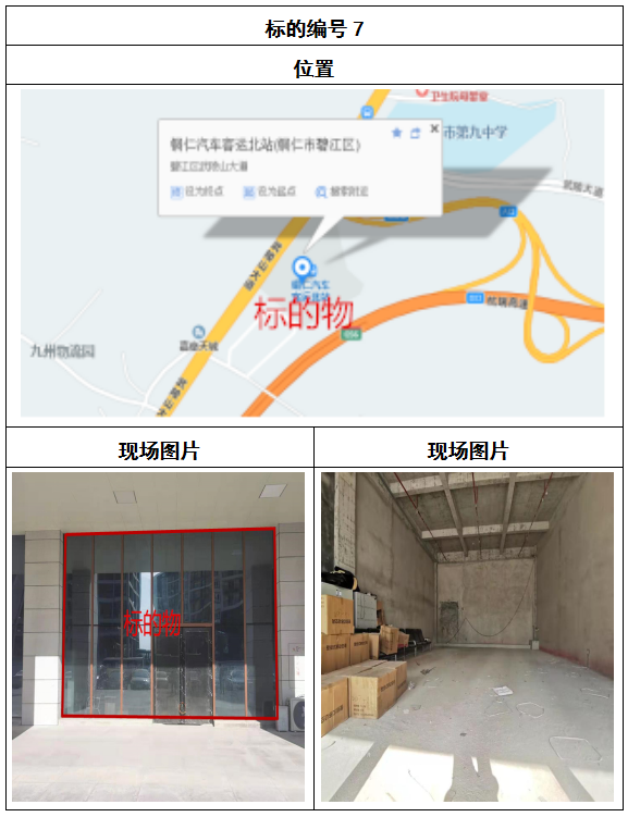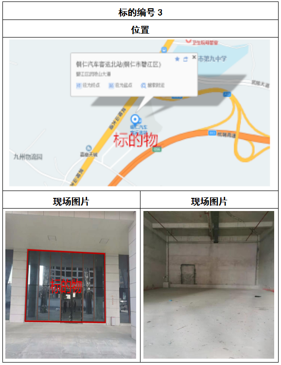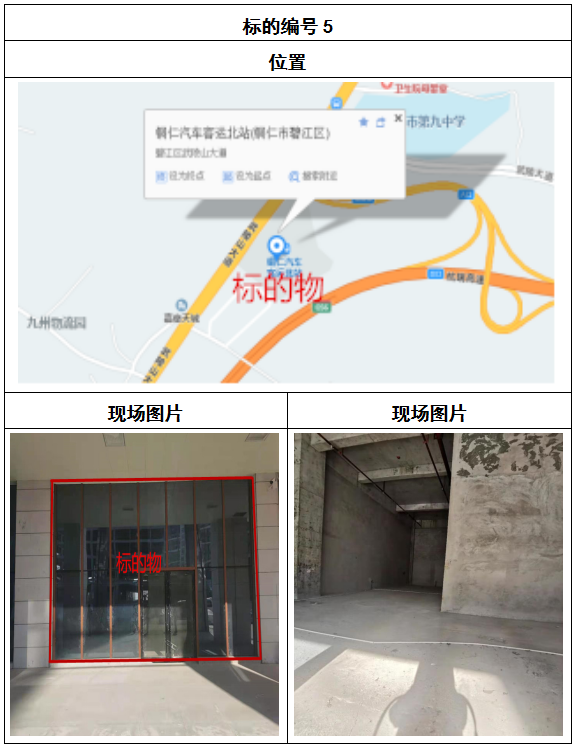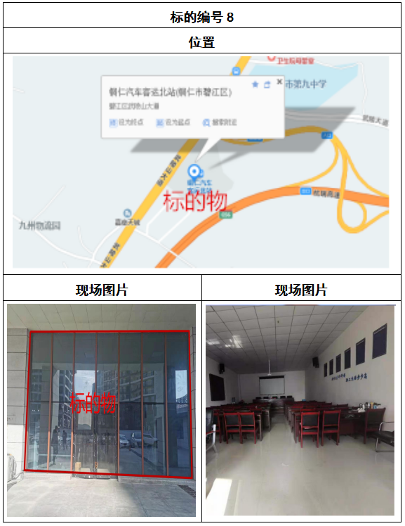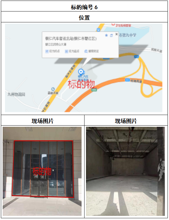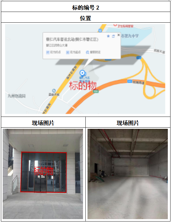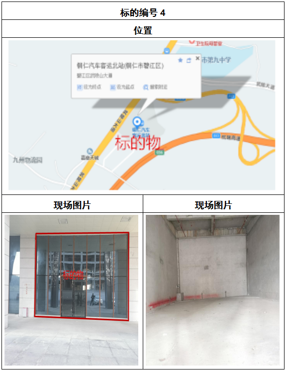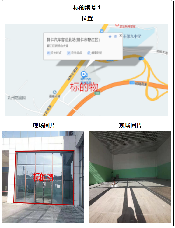 拍品8號和9號標的位于銅仁碧江區川硐汽車客運北站A區進站口負一層8-9號的商業房地產,位于銅仁市中心以北,銅仁汽車北站安置旁,建筑面積分別為:121.5㎡、121.5㎡,租賃期5年,該標的位置交通便利,人流量大。