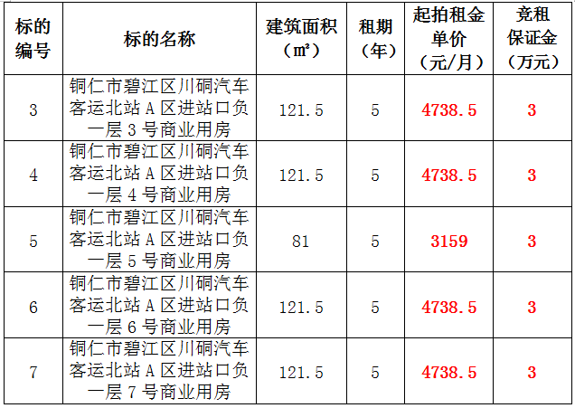 3、銅仁市碧江區川硐汽車客運北站A區進站口負一層3號門面,面積:121.5㎡,租賃期:5年,起拍租金:4738.5元/月,競租保證金:3萬元;