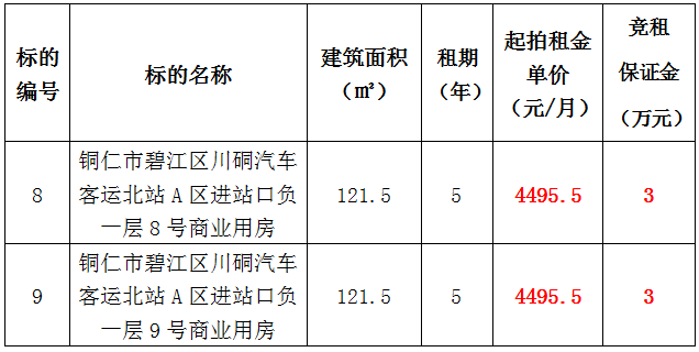 8、銅仁市碧江區川硐汽車客運北站A區進站口負一層8號門面,面積:121.5㎡,租賃期:5年,起拍租金:4495.5元/月,競租保證金:3萬元;