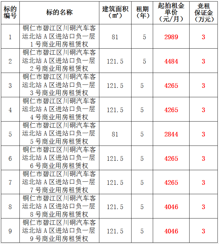 3、銅仁市碧江區(qū)川硐汽車客運(yùn)北站A區(qū)進(jìn)站口負(fù)一層3號(hào)門(mén)面租賃權(quán),面積:121.5㎡,租賃期:5年,起拍租金單價(jià):4265元/月,競(jìng)租保證金:3萬(wàn)元;