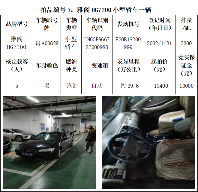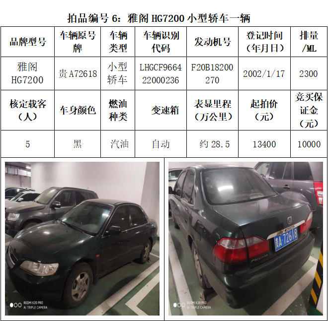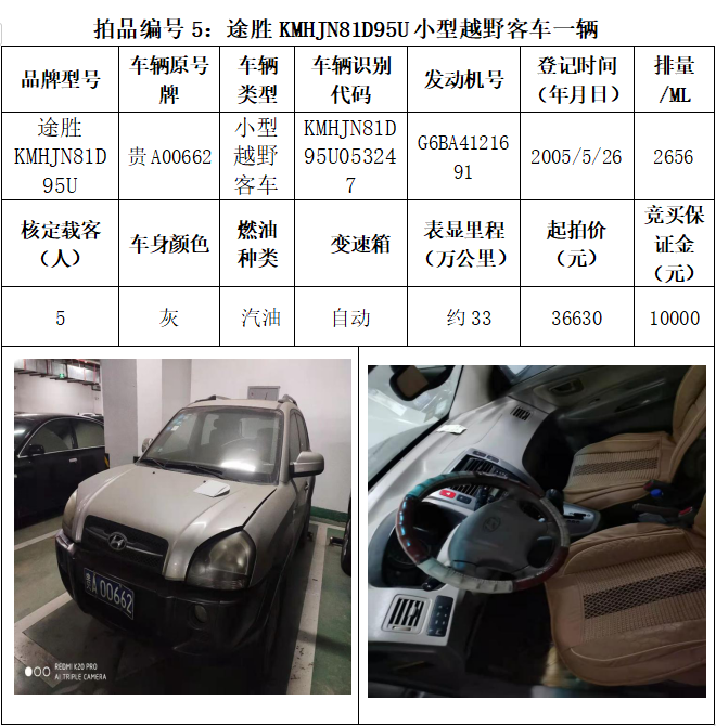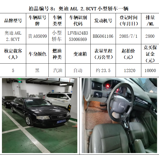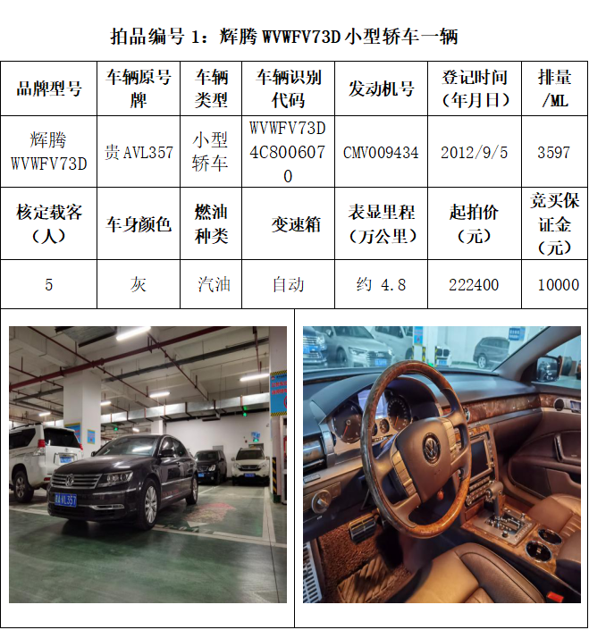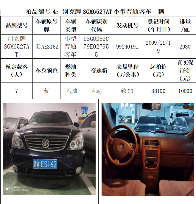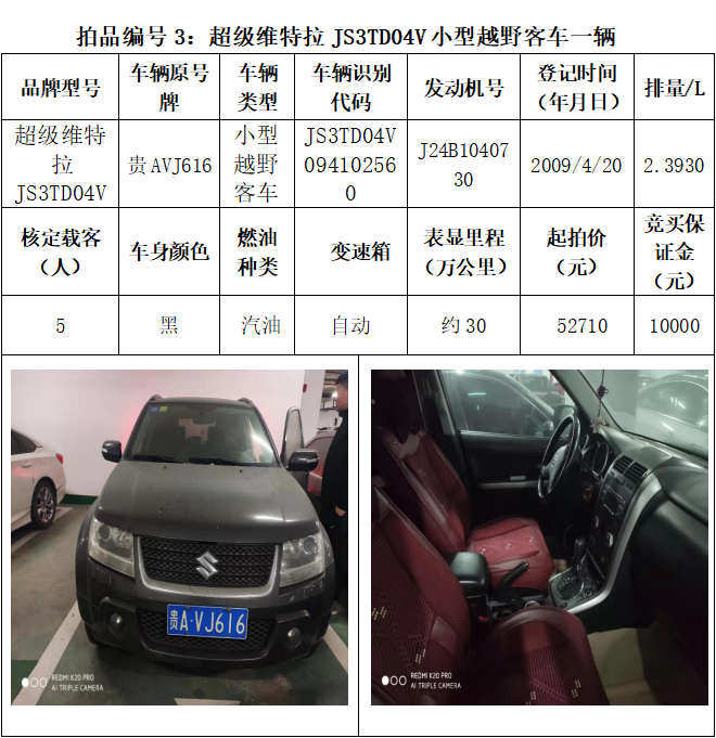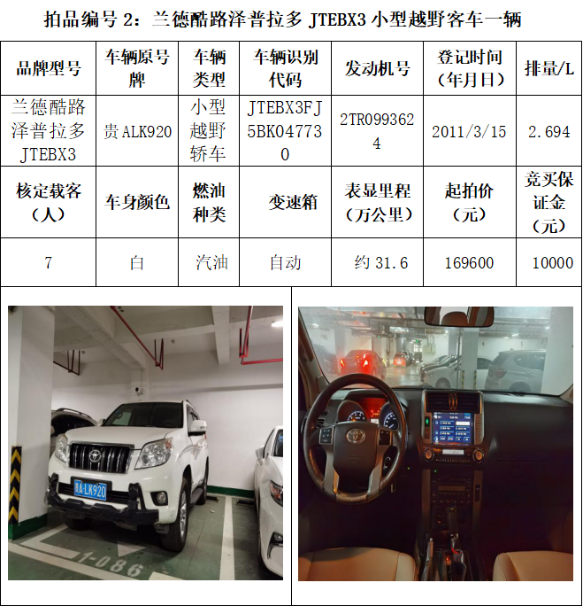 受委托,本公司定于2021年3月26日(星期五)下午14:30時,在貴陽市中華南路20號新大陸數碼廣場10樓D座拍賣廳公開拍賣以下車輛:普拉多越野車1輛、超級維特拉越野車1輛、別克商務旅行車1輛、輝騰轎車1輛、途勝越野車1輛、雅閣轎車2輛、奧迪轎車1輛,共計8輛車。