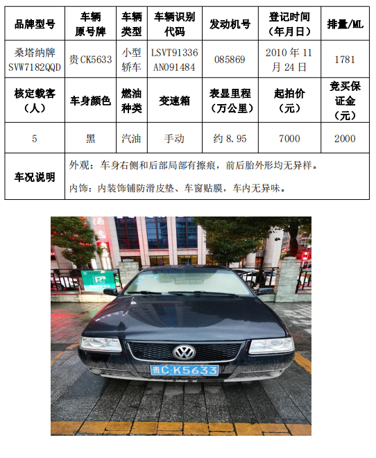 本次拍賣會的拍賣標的(拍品編號1-5共計5輛車),分別為桑塔納牌、捷達牌、昊銳牌、獵豹牌,為打包整體拍賣,不作拆分,整體起拍價:77200元,且只對標的現狀進行拍賣,不作任何質量擔保。