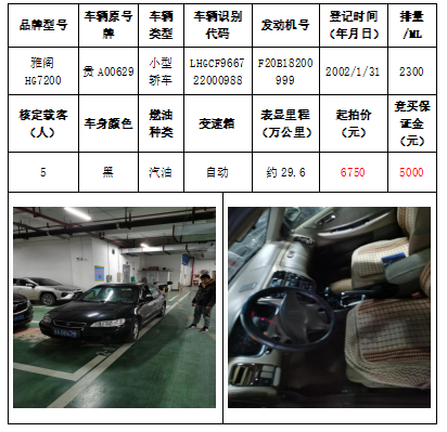 拍品編號1:雅閣HG7200小型轎車一輛