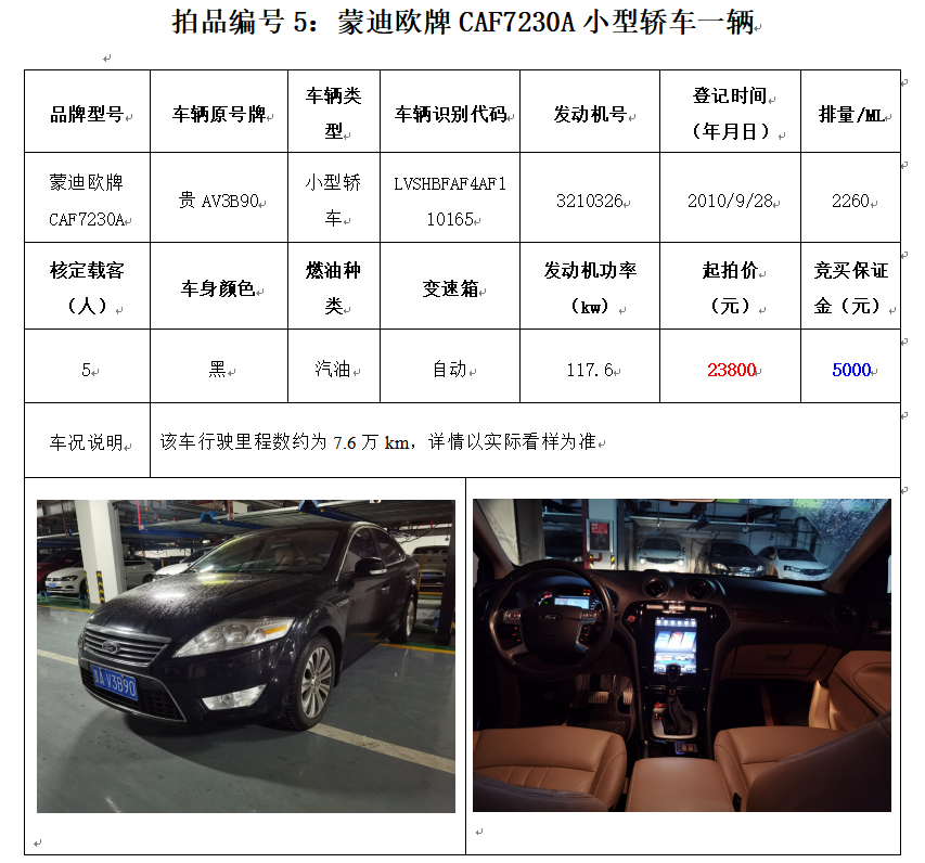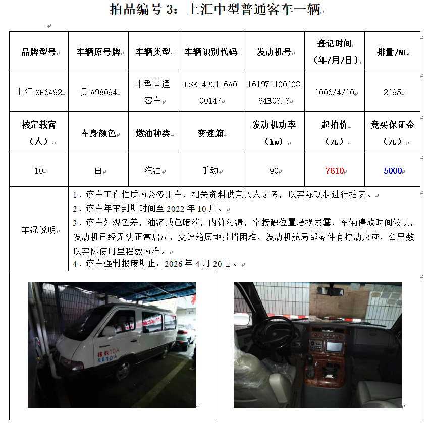 獵豹牌CFA6501AA小型普通客車1輛、江淮牌HFC6470A4R3BE3小型普通客車1輛、上匯SH6492中型普通客車1輛,別克牌SGM6529ATA小型普通客車1輛,蒙迪歐牌CAF7230A小型轎車1輛,共計5輛。