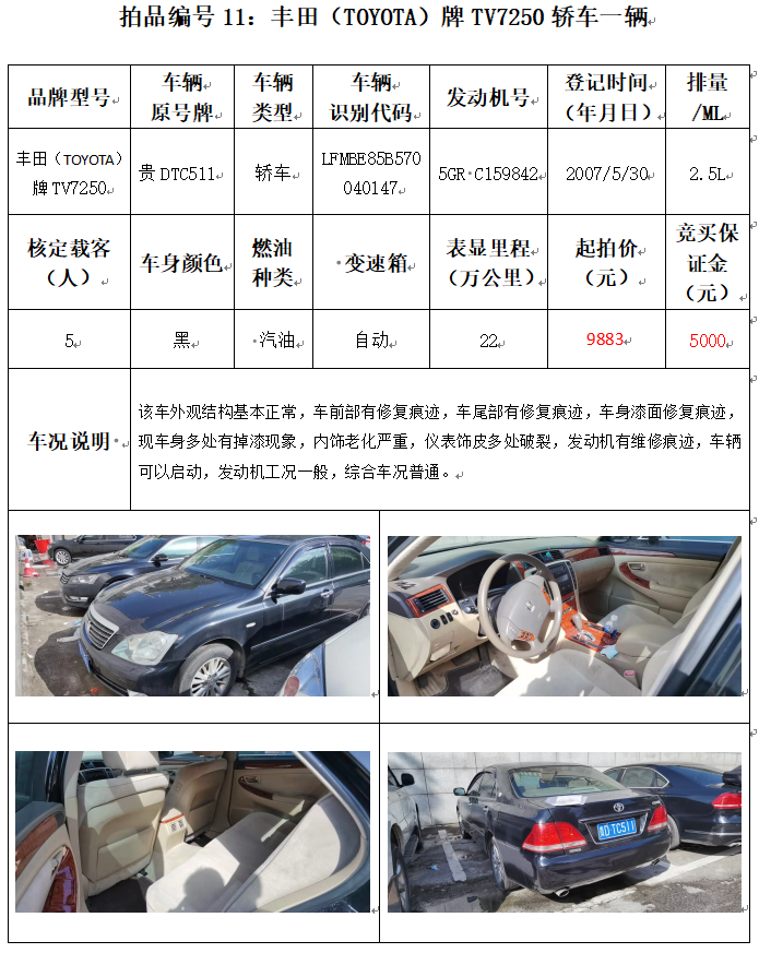 受委托,本公司定于2021年12月10日(星期五)下午14:00時,在銅仁市碧江區(qū)川硐教育園區(qū)誠信路銅仁市公共資源交易中心開標六室(拍賣大廳)公開拍賣以下車輛: