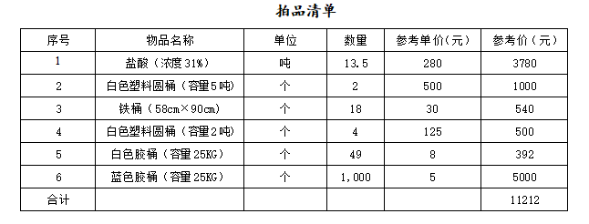 該批標的為整體拍賣,鹽酸是氯化氫(HCl)的水溶液[2],屬于一元無機強酸,工業用途廣泛。鹽酸的性狀為無色透明的液體,有強烈的刺鼻氣味,具有較高的腐蝕性。可用于分析化學、酸洗鋼材、制有機化合物、制無機化合物、控制pH等。