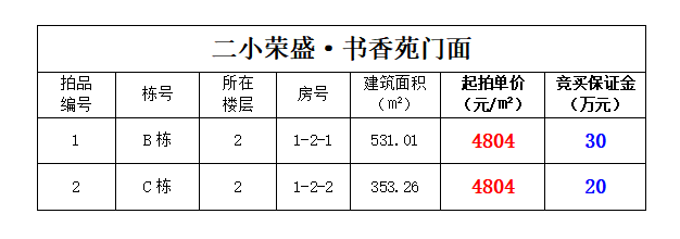 二小榮盛·書香苑門面2間,建筑面積:353.26—531.01㎡,起拍單價(jià):4804元/㎡;