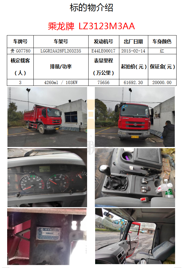 乘龍牌 LZ3123M3AA 貨車 1 輛,車牌號為貴 G07780 起拍價:  61692.30  保證金:2 萬元