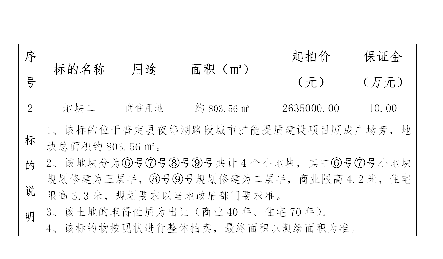 1、普定縣夜郎湖路段城市擴能提質(zhì)建設項目沿線2宗國有土地使用權,地塊一面積約1056.66㎡,地塊二面積約803.56㎡(其中地塊一分為5個小地塊、地塊二分為4個小地塊,土地用途為商住用地)。