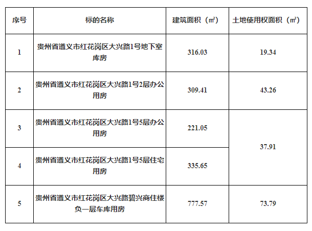 2、貴州省遵義市紅花崗區大興路1號地下室庫房(總建筑面積:316.03㎡);貴州省遵義市紅花崗區大興路1號2層辦公用房(總建筑面積:309.41㎡);貴州省遵義市紅花崗區大興路1號5層辦公用房(總建筑面積:221.05㎡);貴州省遵義市紅花崗區大興路1號5層住宅用房(總建筑面積:335.65㎡);貴州省遵義市紅花崗區大興路碧興商住樓負一層車庫用房(總建筑面積:777.57㎡)。