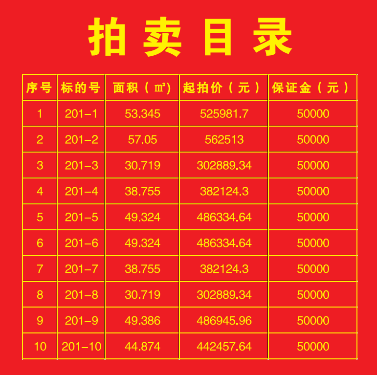 1、安順市西秀區建軍路4號順大廣源公寓2幢2-6單元2層201-1號至201-10號共計10個商業用房,位于地面1層(對面為安順市第二幼兒園),建筑面積30㎡—57㎡不等,起拍價:30.28萬元—52.59萬元不等,保證金:每個標的5萬元整(標的物詳情以拍賣資料為準)。