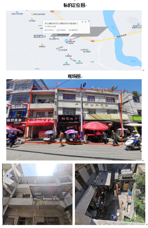 1、該標的位于大方縣雙山鎮富民北路(004縣道旁),建成于1996年,占地面積156.13㎡。樓層共三層,總建筑面積:404.62㎡,一層為臨街商鋪4間。水、電設施齊全,裝修一般,房屋建筑結構為磚混結構,規劃條件為辦公樓,土地用途為公共管理和公共服務用地。