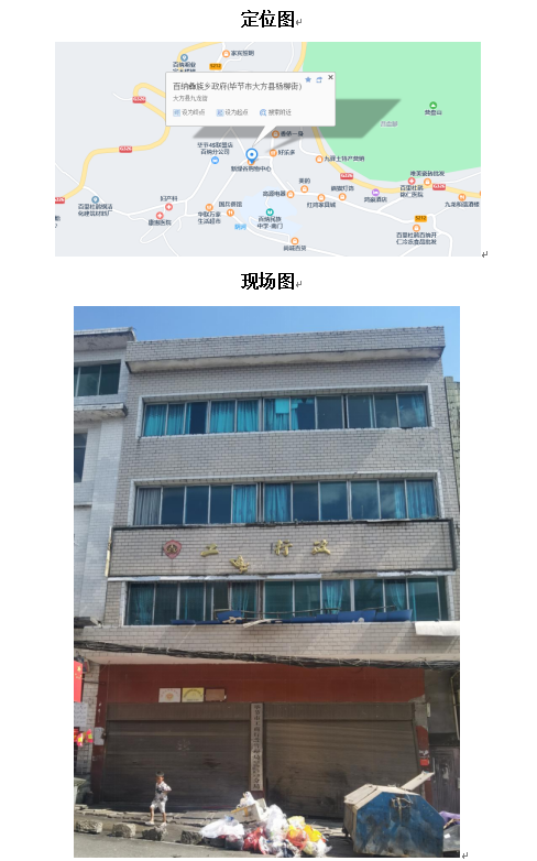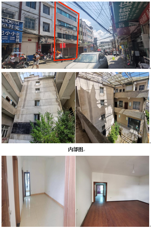 1、該標的位于大方縣百納鄉政府旁,建成于2003年,占地面積264.9㎡。共四層,分為前后兩棟。前棟:一層為門面2間,面積合計76.83㎡,現為閑置狀態;二、三層面積分別為116.7㎡;四層面積為56.05㎡;前棟面積共計366.28㎡。后棟:半地下層在鄉政府院內,面積為38.9㎡;一、二層面積分別為137.43㎡;三層面積為95.73㎡;后棟面積共計409.48㎡。前后兩棟建筑面積共計為775.77㎡。
